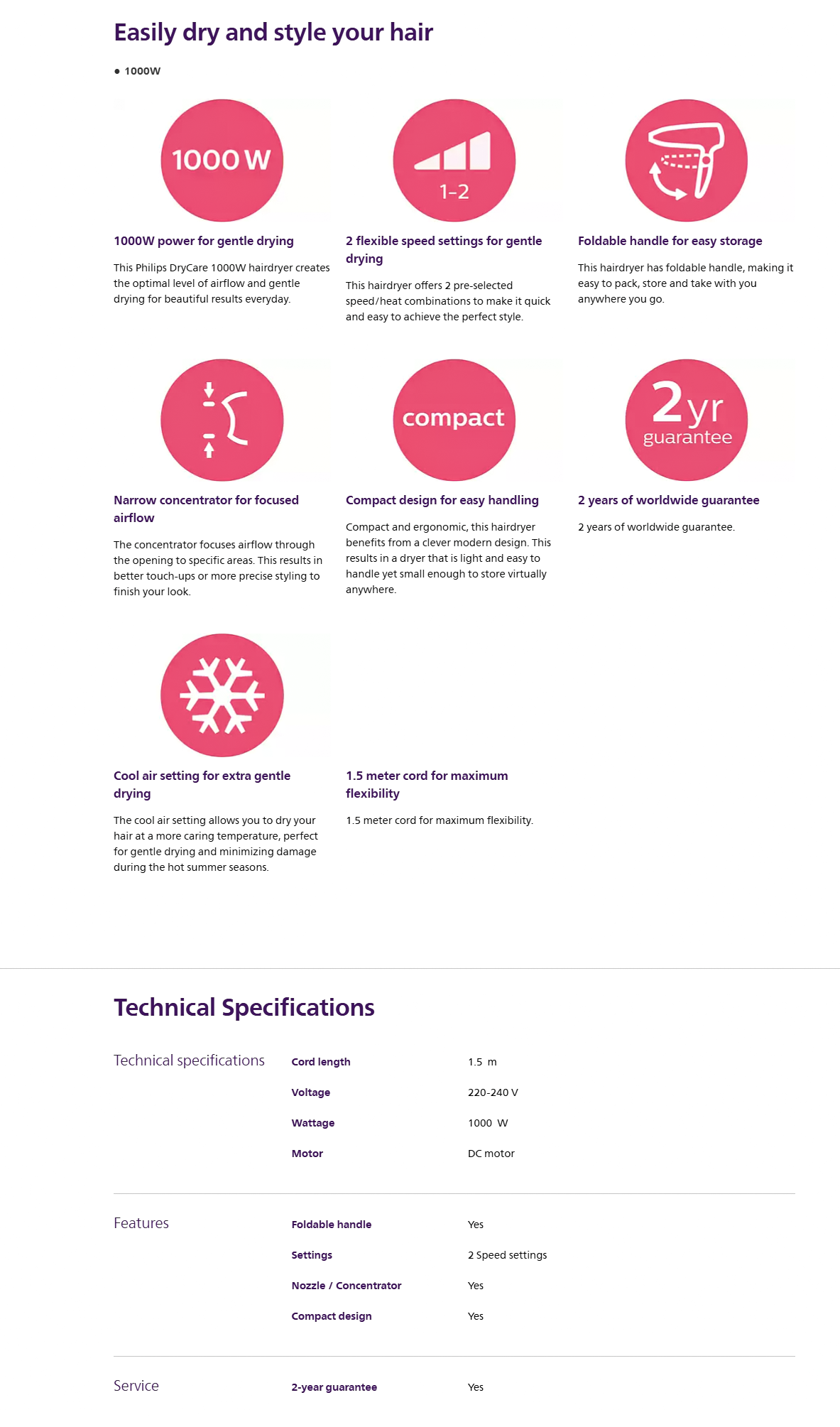 This Philips Essential hairdryer packs the perfect balance of drying and styling power. The dryer is compact and can easily be used at home or taken on the road. Get the beautiful and gentle results you desire, wherever you go.