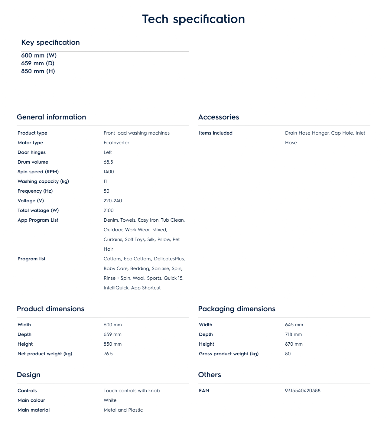ELECTROLUX 11kg UltimateCare 700 front load washing machine EWF1143R7WC