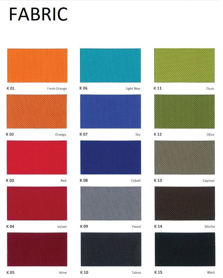 FABRIC K01 FRESH ORANGE FABRIC K02 ORANGEFABRIC K03 REDFABRIC K04 VELVETFABRIC K05 WINE FABRIC K06 LIGHT BLUEFABRIC K07 SKYFABRIC K08 COBALT FABRIC K09 PASEDFABRIC K10 TABOOFABRIC K11 OASISFABRIC K12 OLIVEFABRIC K13 CAYMANFABRIC K14 MOCHAFABRIC K15 BLACKFABRIC 01 CAYMANFABRIC 02 ARECIBOFABRIC 03 BAHAMAS FABRIC 05 WINDJAMMERFABRIC 07 SCUBAFABRIC 08 DESSERTFABRIC 12 BLACK GLORYFABRIC 13 HULAFABRIC 15 DEMERERAFABRIC 17 PASEDFABRIC 18 SLIPFABRIC 22 CALYPSOFABRIC 23 MARTIQUEFABRIC 26 BERMUDAFABRIC 29 TABOOFABRIC 28 JAMAICA PU 801 WHITE PU 802 ORANGEPU 803 MAIZEPU 805 OASISPU 806 TAUPEPU 807 OLIVEPU 808 PINK PU 809 YELLOW PU 810 NIGHT SKYPU 811 GREEN PU 812 REDPU 815 MOCHAPU 816 LAGOONPU 817 VELVET PU 820 BLUEPU 821 RUBYPU 822 OAKPU 823 BLACK PU 825 COSTAPU 827 LIGHT ORANGEPU 828 CEYON YELLOWPU 829 SAND STONEPU 830 SHADOWPU 831 LAVENDERPU 832 SKY BLUEPU 833 CHOCOLATE