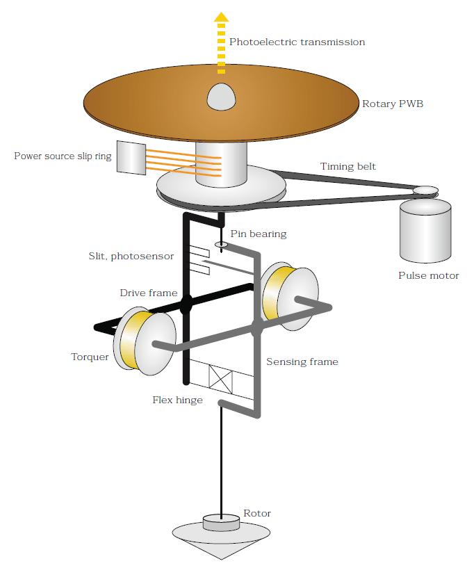 A feedback current flows through the Torquer so that the deviation between the drive frame and the sensing frame generated during measurement becomes zero, pushing the sensing frame back.