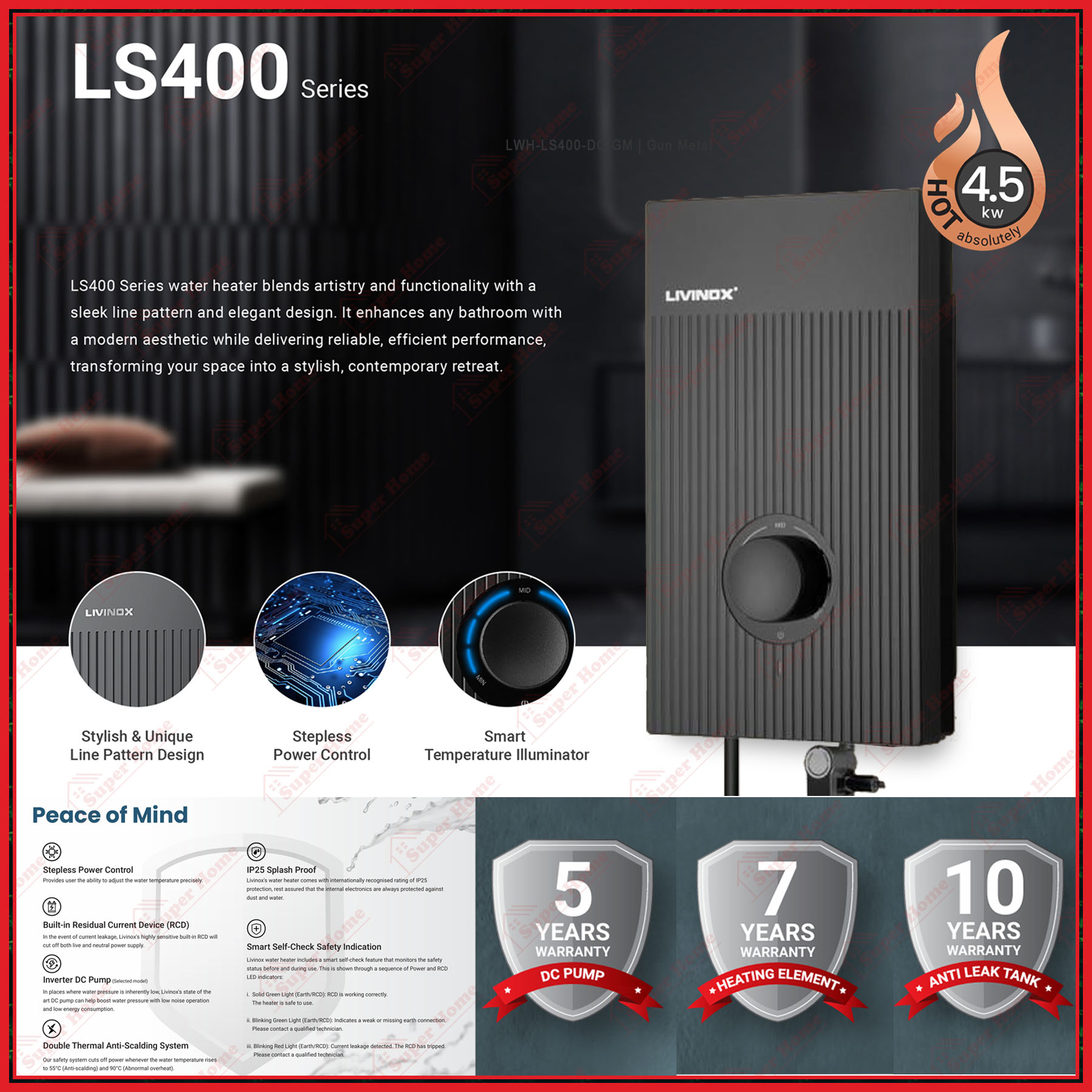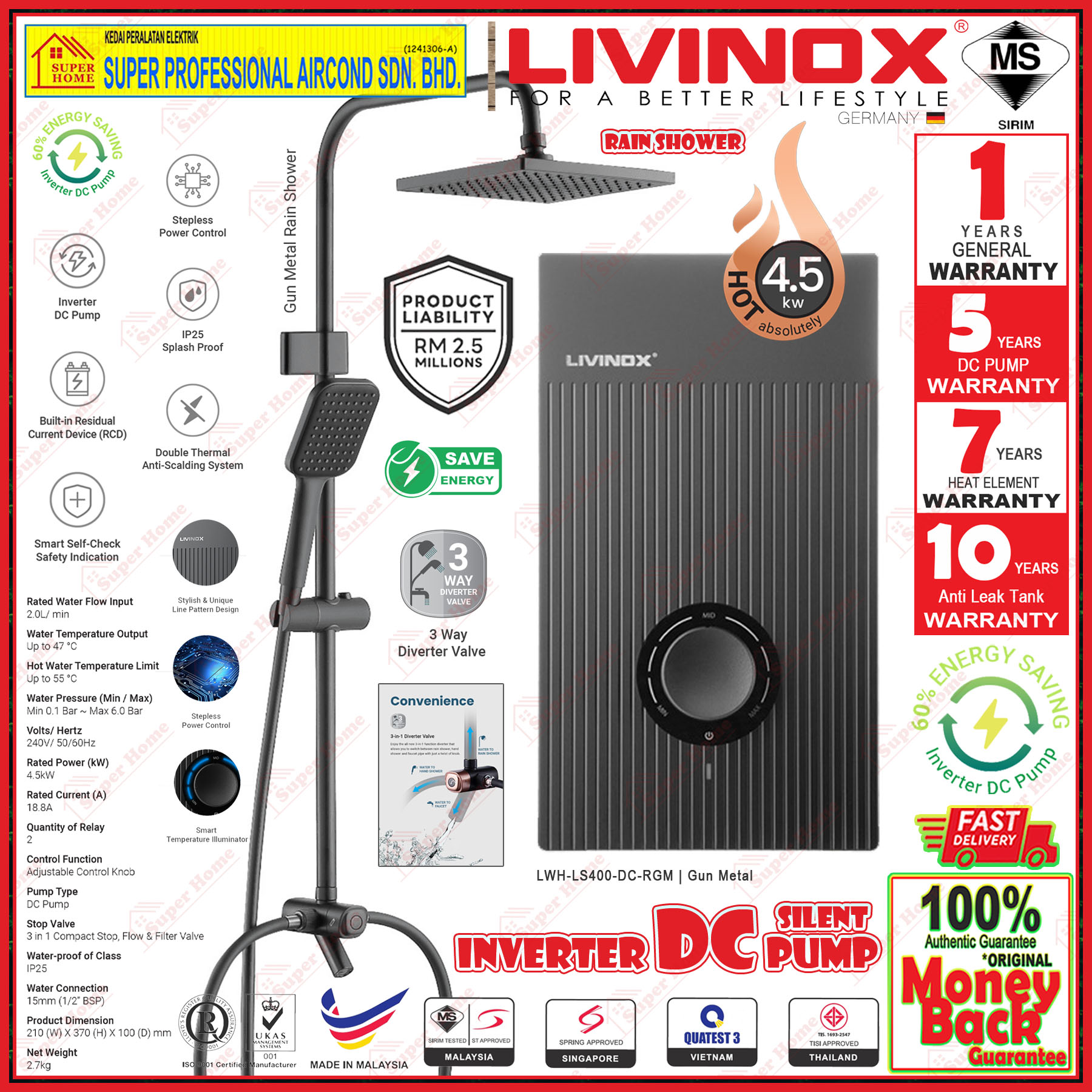 Livinox Water Heater LWH-LS400-DC-RGM DC Inverter Silent Pump Instant Water Heater with Rain Shower Gun Metal