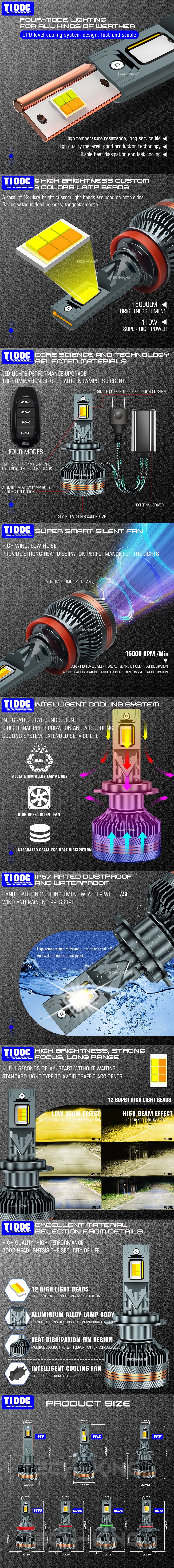 The T100C LED Headlight is a high-quality auto lighting system designed for multiple vehicle models. It offers four light color modes — 6000K, 4300K, 3000K, and flash — providing versatile illumination options for different driving conditions.