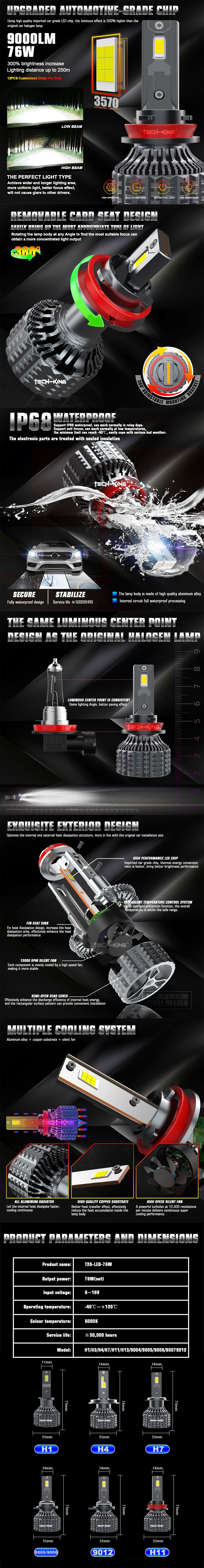 The T26 LED Headlight Bulb is a high-performance automotive lighting solution designed to deliver bright and stable illumination. Operating at 76W per pair and producing 10000 lumens, it provides powerful brightness and improved road visibility for various driving conditions.