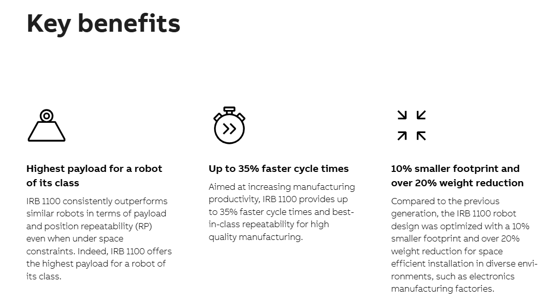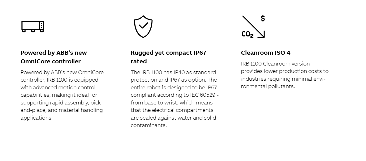 Aimed at increasing manufacturing productivity, IRB 1100 provides up to 35% faster cycle times and best-in-class repeatability for high quality manufacturing. IRB 1100 consistently outperforms similar robots in terms of payload and position repeatability (RP) even when under space constraints. Indeed, IRB 1100 offers the highest payload for a robot of its class. Compared to the previous generation, the IRB 1100 robot design was optimized with a 10% smaller footprint and over 20% weight reduction for space-efficient installation in diverse environments, such as electronics manufacturing factories. The IRB 1100 is powered by OmniCore E10 ultra-slim, C30 compact, and C90XT rugged compact controllers.