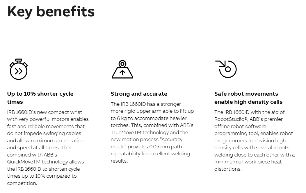 When shorter cycle times, unmatched versatility, and a smaller, more powerful wrist matter - ABB’s IRB 1660ID is the robot of choice.