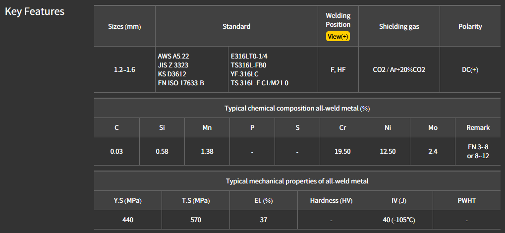 EN: ISO 17633-B : TS 316L-F C1/M21 0