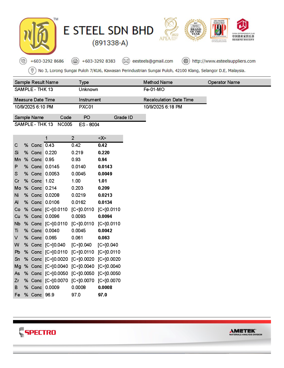 Below is the PMI Report of the 4140 4140QT Steel Plate that we have performed.