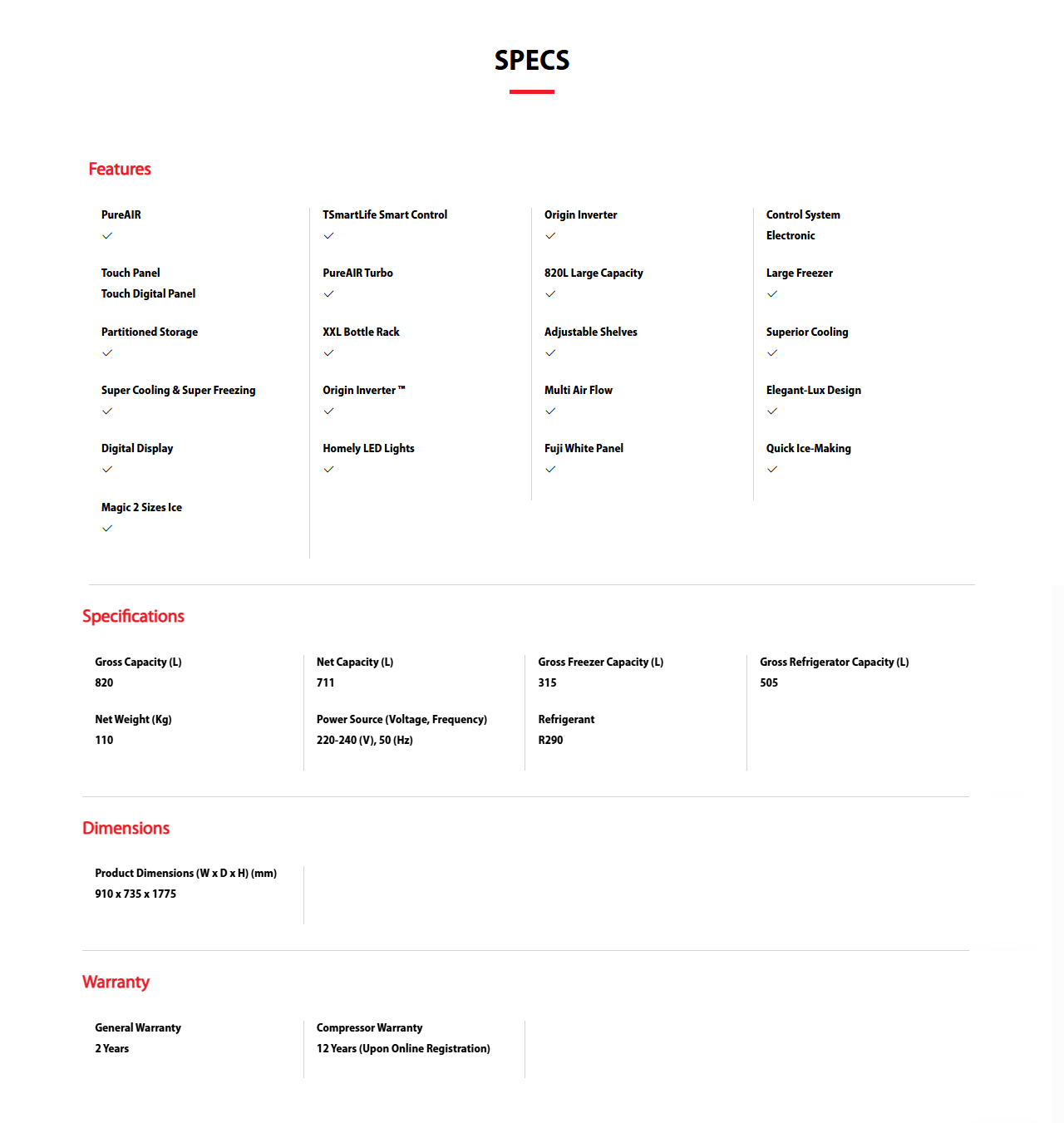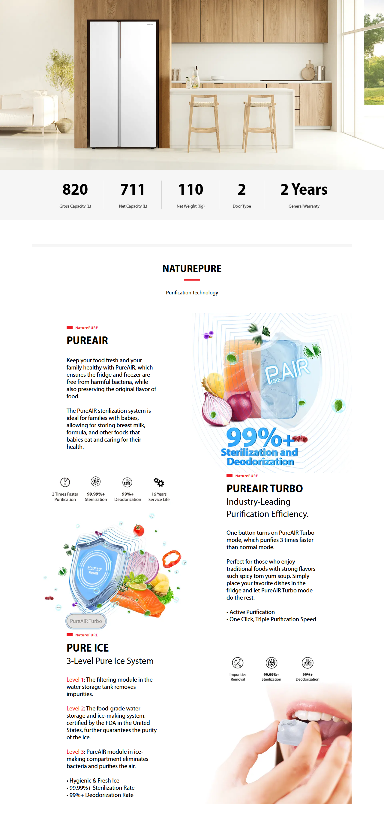 Our exclusive 820L large capacity refrigerator, with its superior PureAIR Turbo air purification system, offers the optimal large capacity storage solution for modern lifestyles.