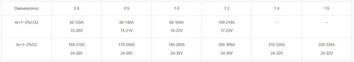 - Use Ar+1~2%O2 for spray transfer and Ar+1~2%CO2 for short-circuit transfer.
