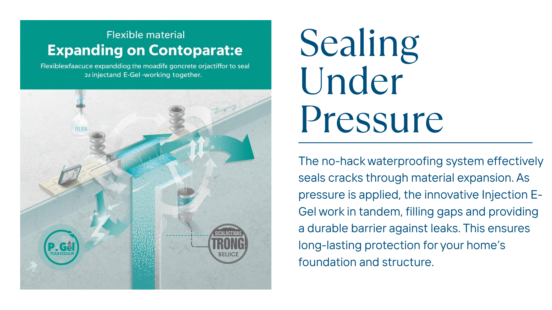 Kaedah kalis air terbaik menggunakan teknologi yang saling melengkapi. Suntikan PU (poliuretana) berfungsi bersama kalis air E-Gel untuk mencipta duo berkuasa yang menghalang air daripada masuk.