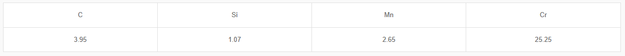 Weld metal is a chromium carbide structure with 25% Cr. It provides excellent hardness and abrasion resistance at high temperature due to higher chromium carbide content