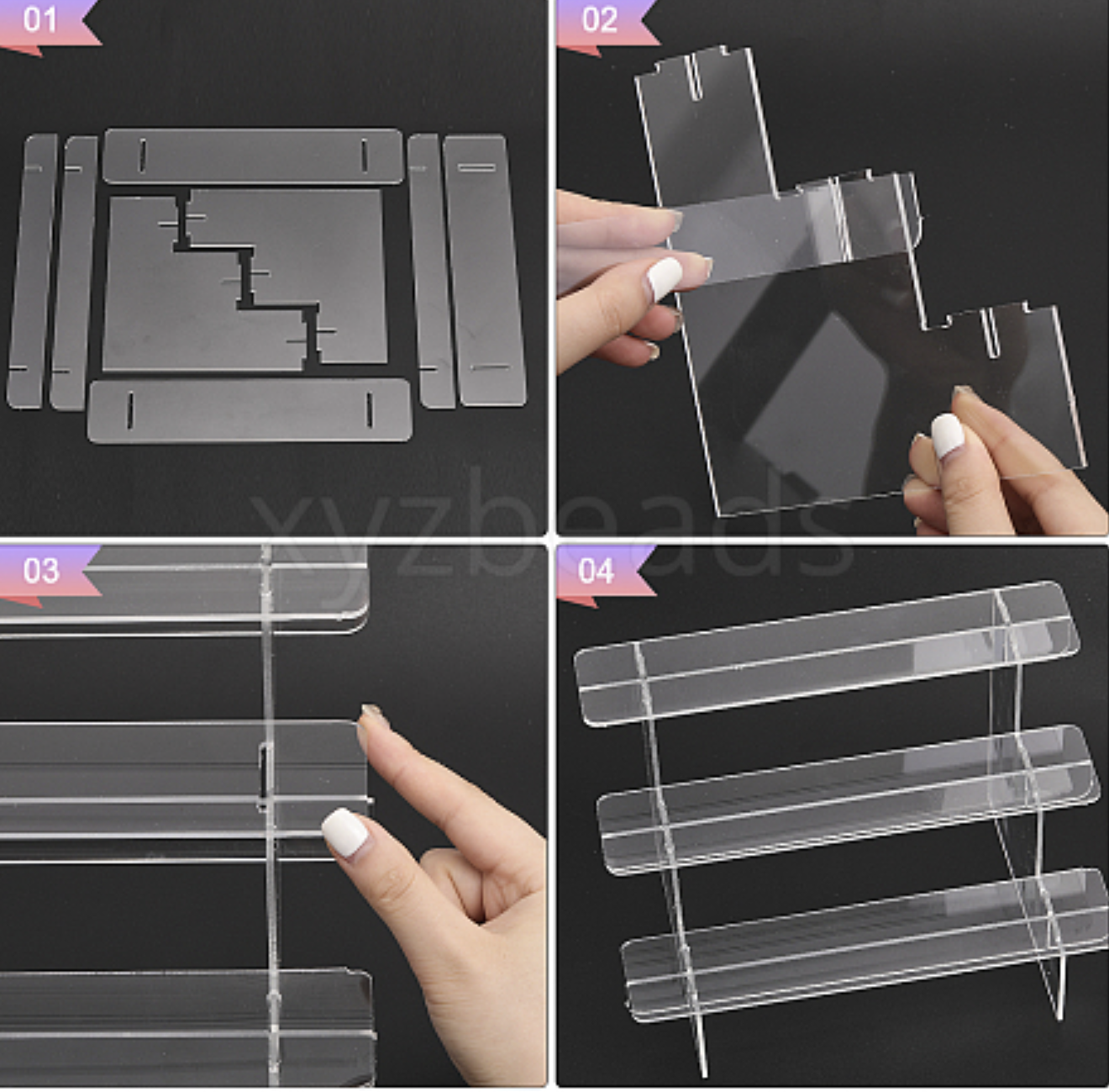 Tier Display Riser: Acrylic ladder display rack shelf riser, multi tier display for countertops. Application: Acrylic display riser stand great for displaying and organizing, accessories or wallet, figures, perfume, glasses ,mobile phone,toiletries, or any other knickknacks. Advantages: The raised tiers help catching feature of your products. Display Or Collection: display an assortment of products in a neat and organized arrangement. Solid and Easy to Assembly: These display rack made of acrylic material, smooth edge, durable and solid; no need to screw to complete the assembly, and very firmly. Free glue.