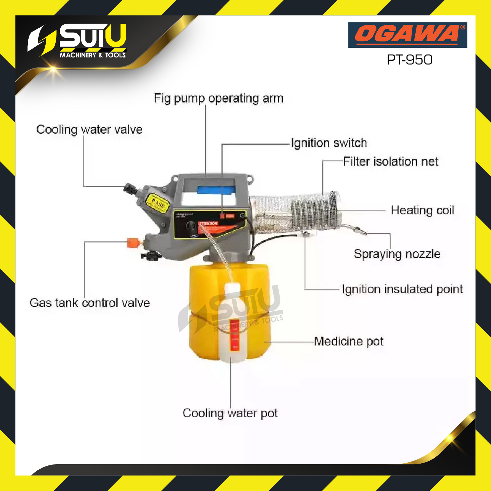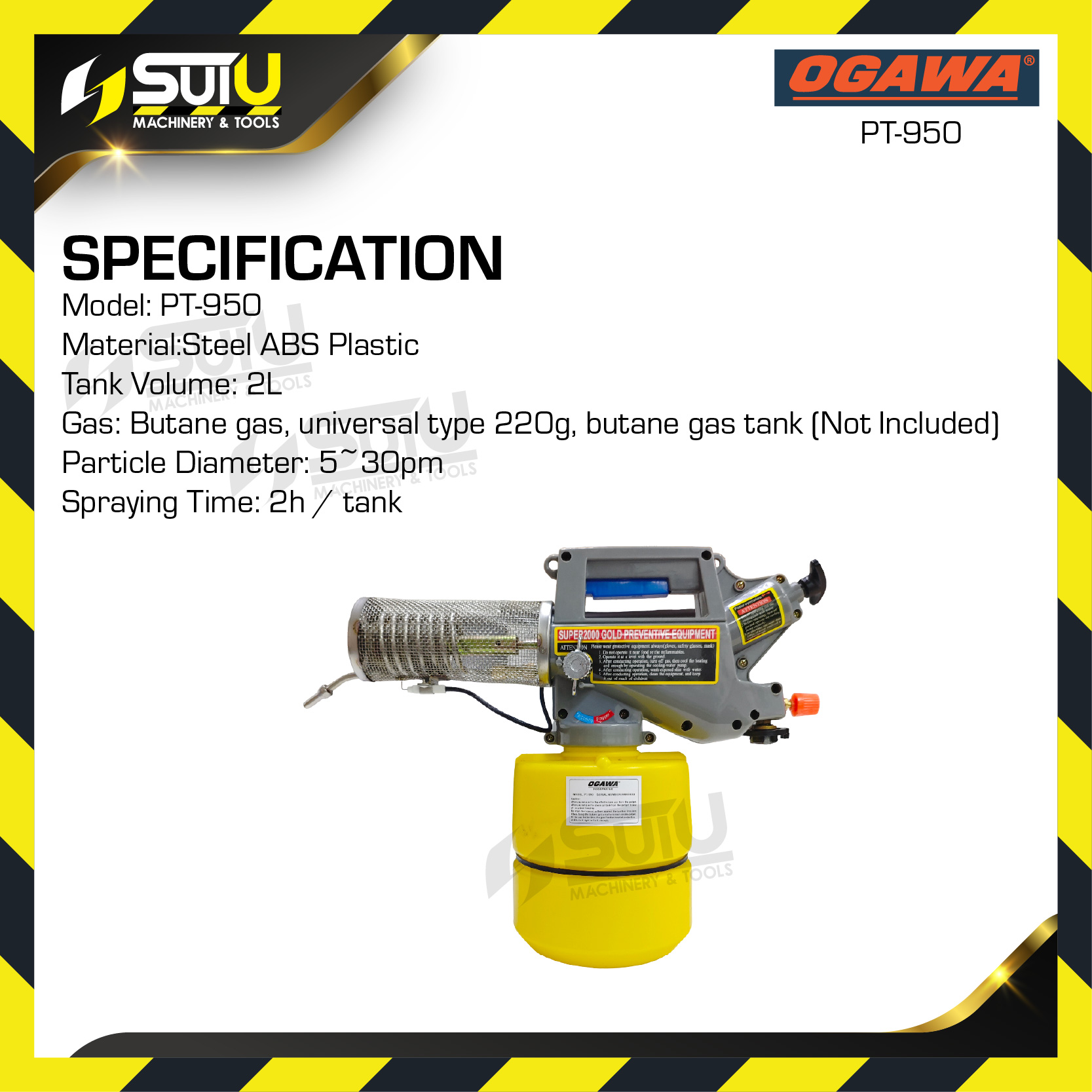 +PSPECIFICATION+P - Brand : Ogawa - Model : PT-950 - Material : Steel ABS Plastic - Tank Volume : 2L - Gas : Butane gas,universal type 220g,butane gas tank (Not Included) - Particle Diameter : 5 ~ 30pm - Spraying Time : 2h/tank