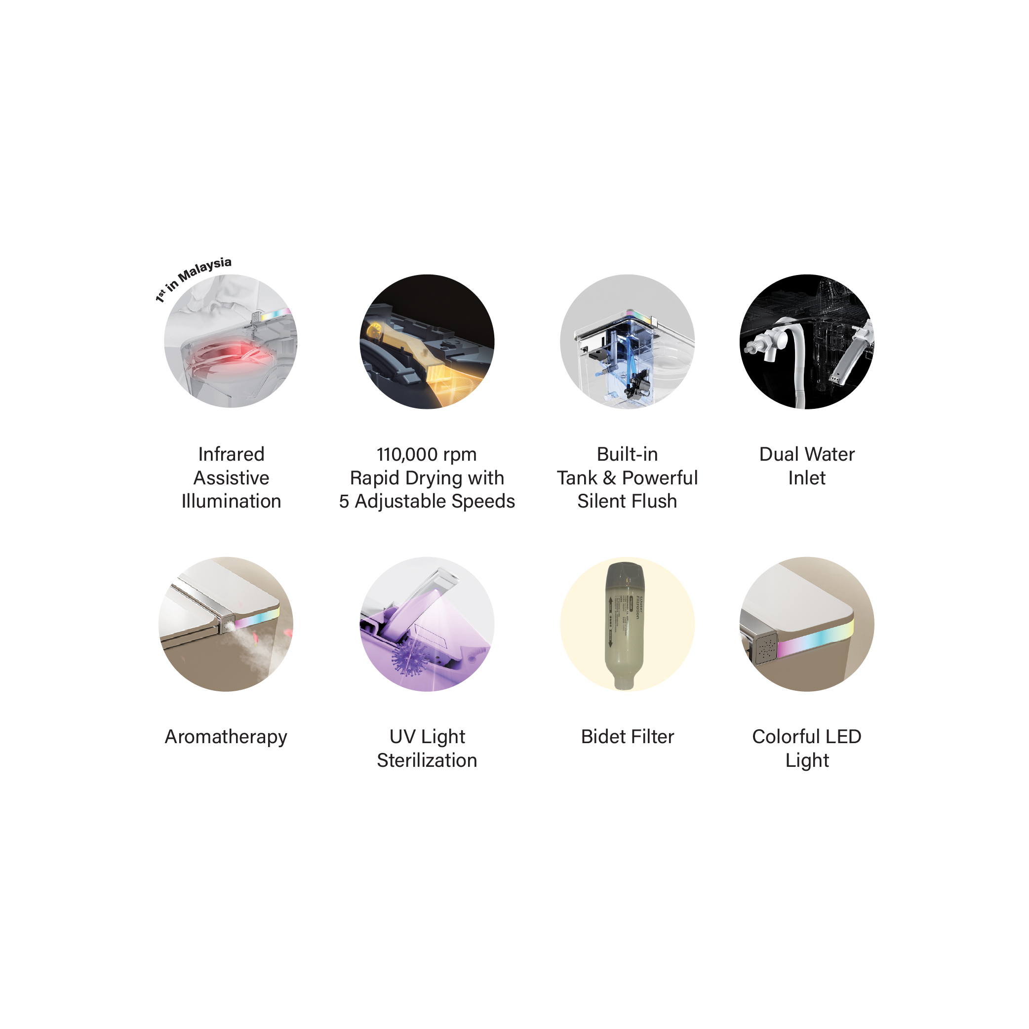 Bareno LUX WI164W Intelligent Water Closet 5L Dynamic Vortex Flush BO Adjustable 225-275mm Dimension: L685 x W410 x H455mm Color: White Materials: Vitreous China