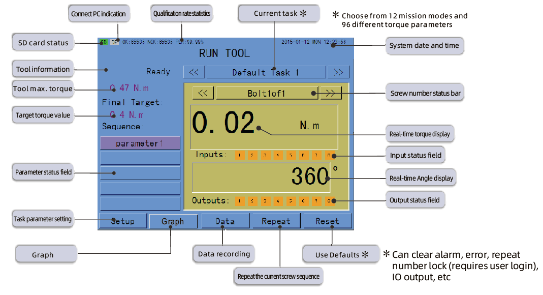 Collects data and handles anomalies, displaying real-time tightening data including torque, angle, and time, and reducing rework costs due to issues like floating or stripped screws.