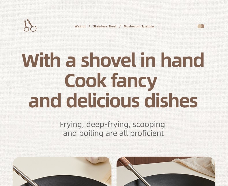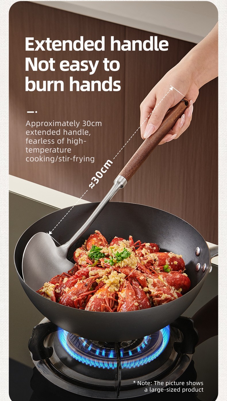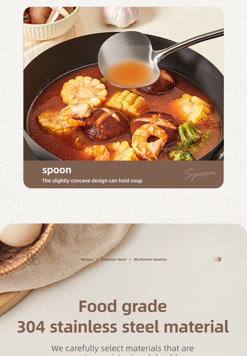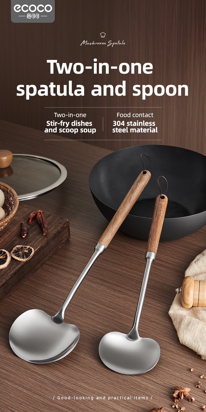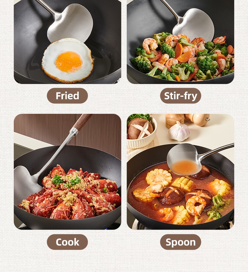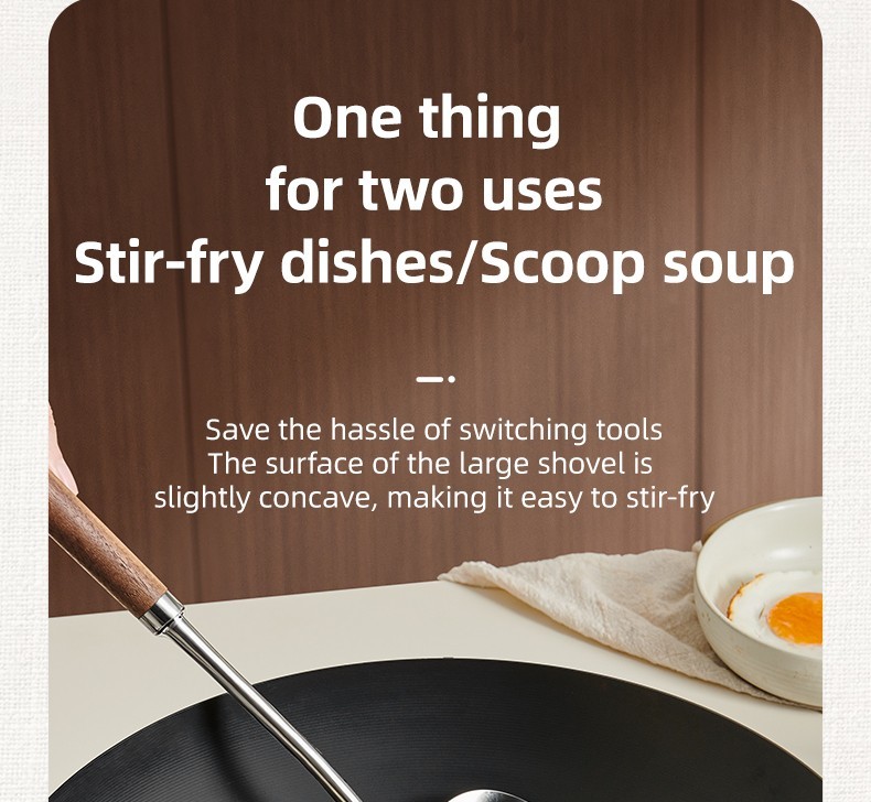 2-in-1 Design  Includes mushroom-style wide spatula for stir-frying + slightly concave ladle for soup.