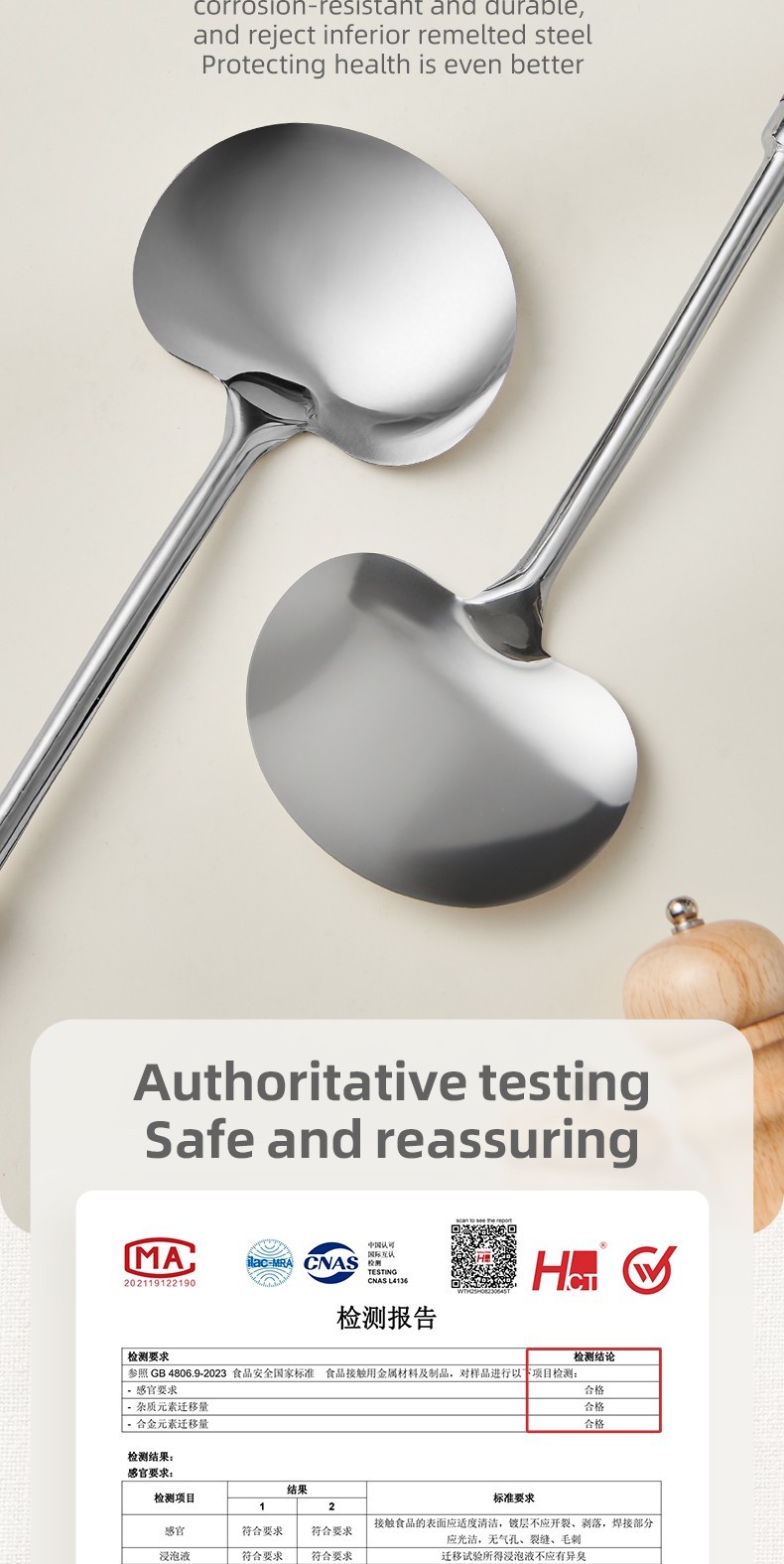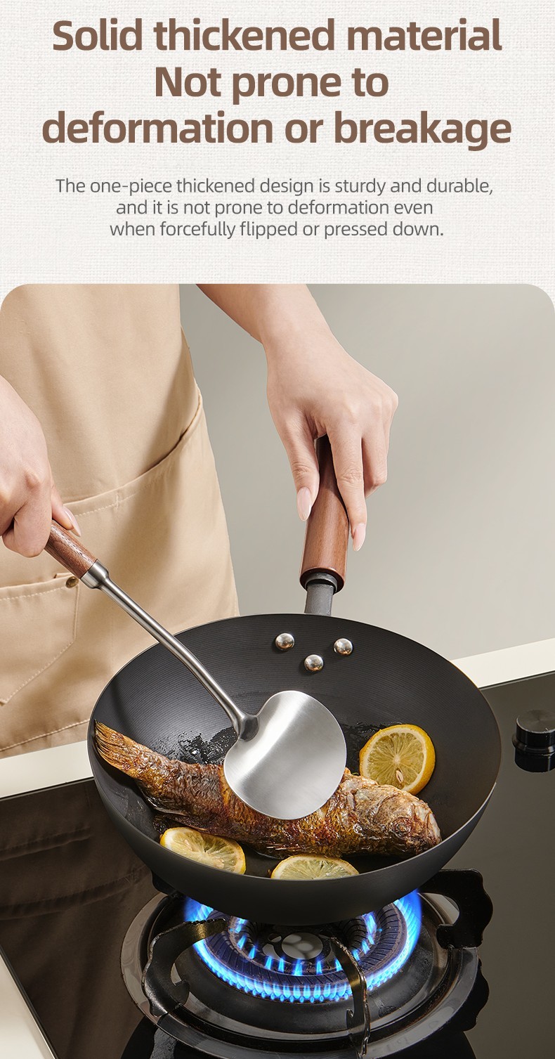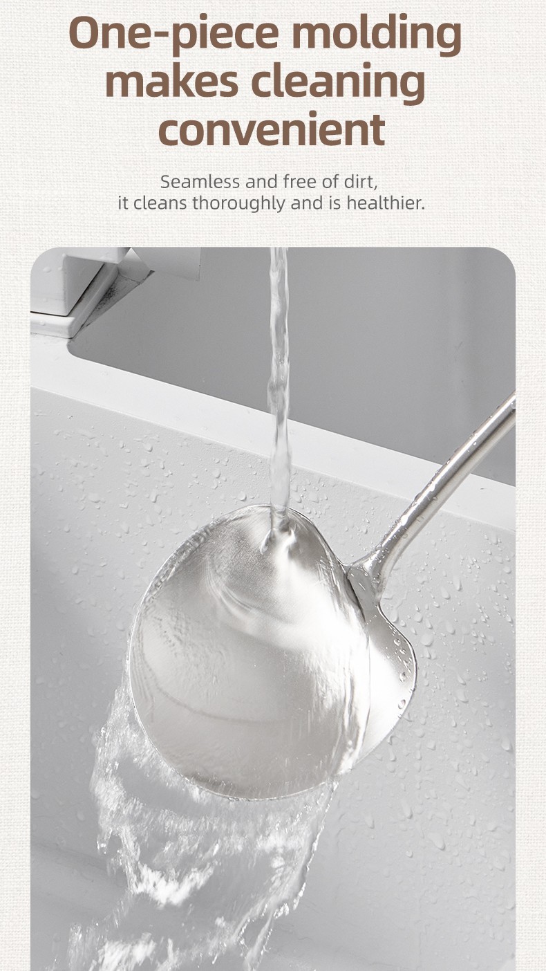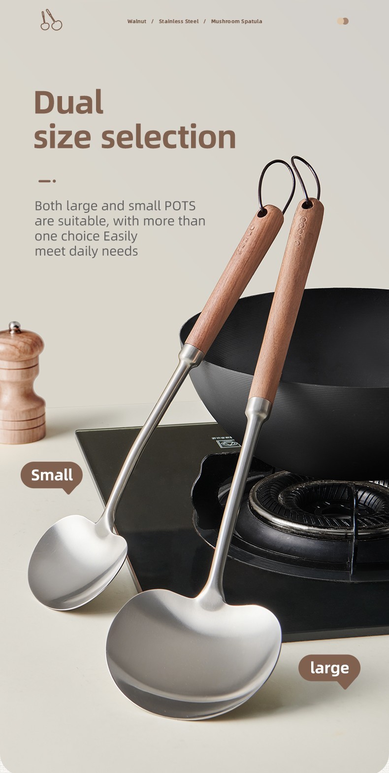 2-in-1 Design  Includes mushroom-style wide spatula for stir-frying + slightly concave ladle for soup.