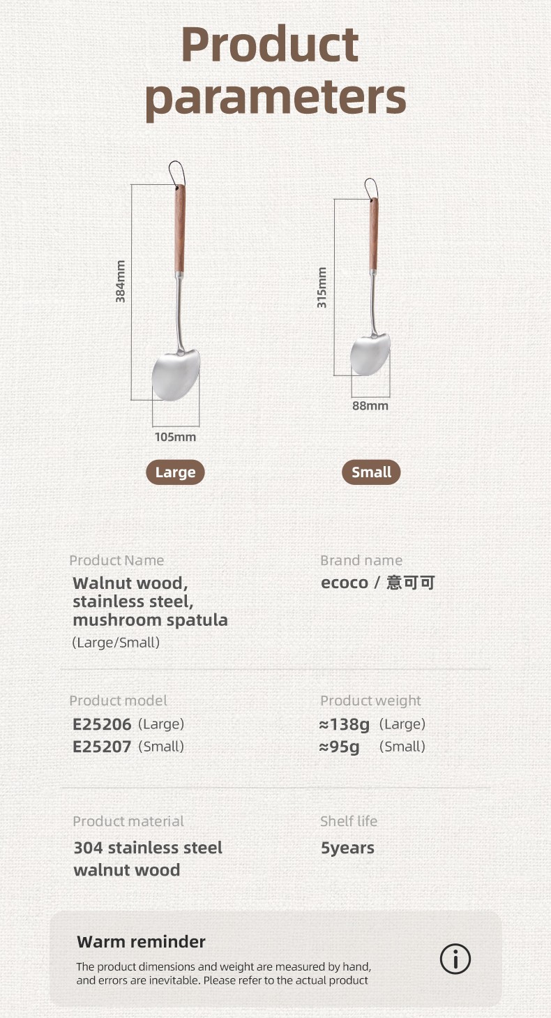 Upgrade your kitchen tools with this elegant and durable ECOCO cooking shovel set. Made from food-grade 304 stainless steel with natural North American walnut wood handles, it offers excellent heat resistance, durability, and comfortable grip.