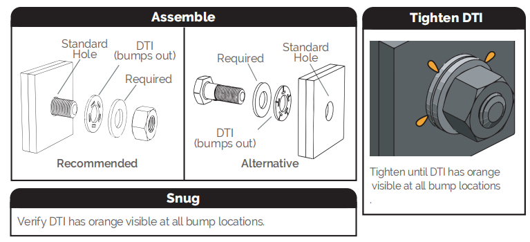 All high-strength structural bolts shall include an F959/F959M Squirter® DTI, quenched and tempered in accordance with ASTM F959/F959M Section 4.3.2, and manufactured by Applied Bolting Technology. DTIs shall be installed and inspected in accordance with RCSC Section 2.12 instructions.