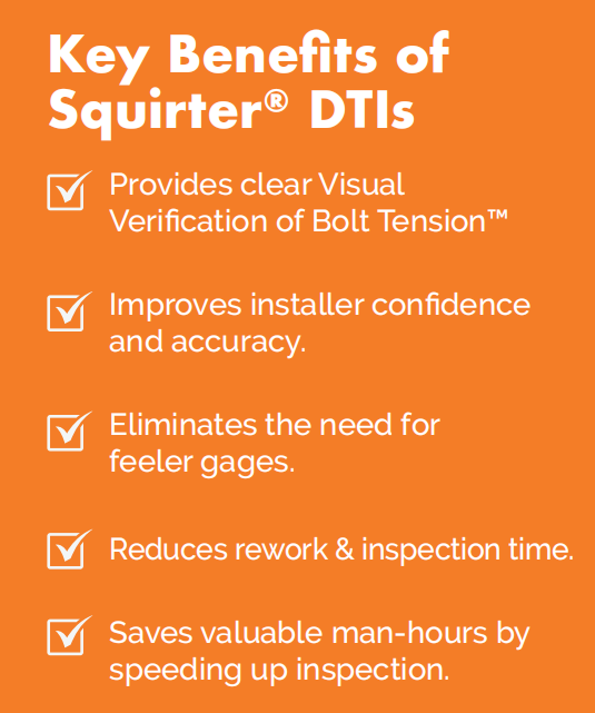 Squirter® Direct Tension Indicators (DTIs) provide Visual Verification of Bolt Tension™, ensuring structural integrity in construction projects. They are utilized globally by end users or major engineering, procurement, construction and management(EPC/EPCM) companies such as Shell, Dow, ADNOC, Bechtel, Fluor, Chiyoda, Technip, Worley, Kiewit and Burns & McDonnell, etc.