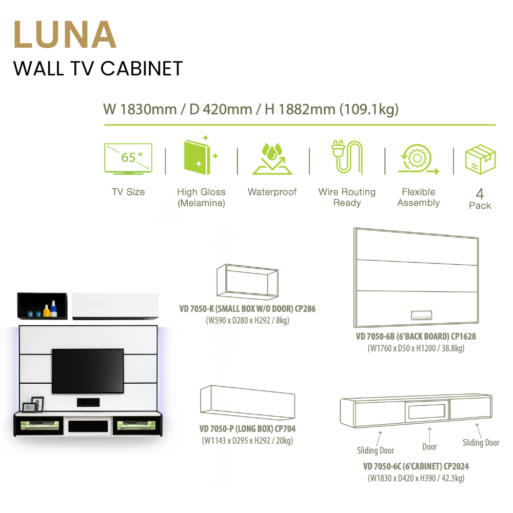 A modern modular wall-mounted TV cabinet designed for living rooms, condominiums, studios, hotel suites, and office lounges. The LUNA set includes a full backboard panel, upper display box, long storage box, and a sliding-door cabinet.