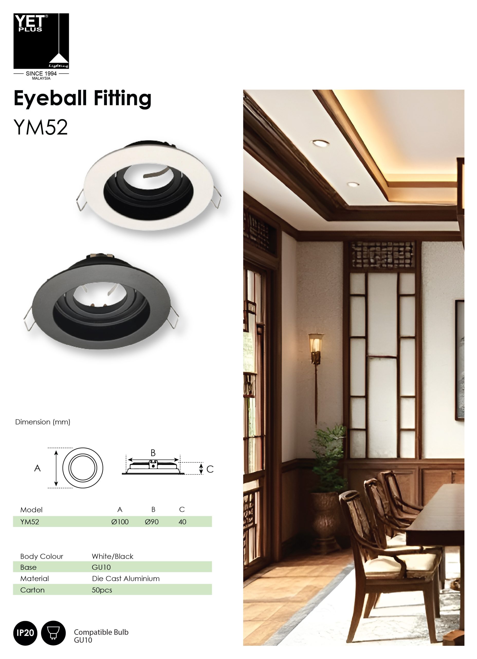 Built using durable die-cast aluminium, the YM52 fitting offers superior heat dissipation and long-term structural stability. Its sleek recessed design blends seamlessly into ceilings, while the adjustable eyeball mechanism provides flexible lighting angles for targeted illumination. Available in Black and White, it suits both contemporary and classic interior styles.