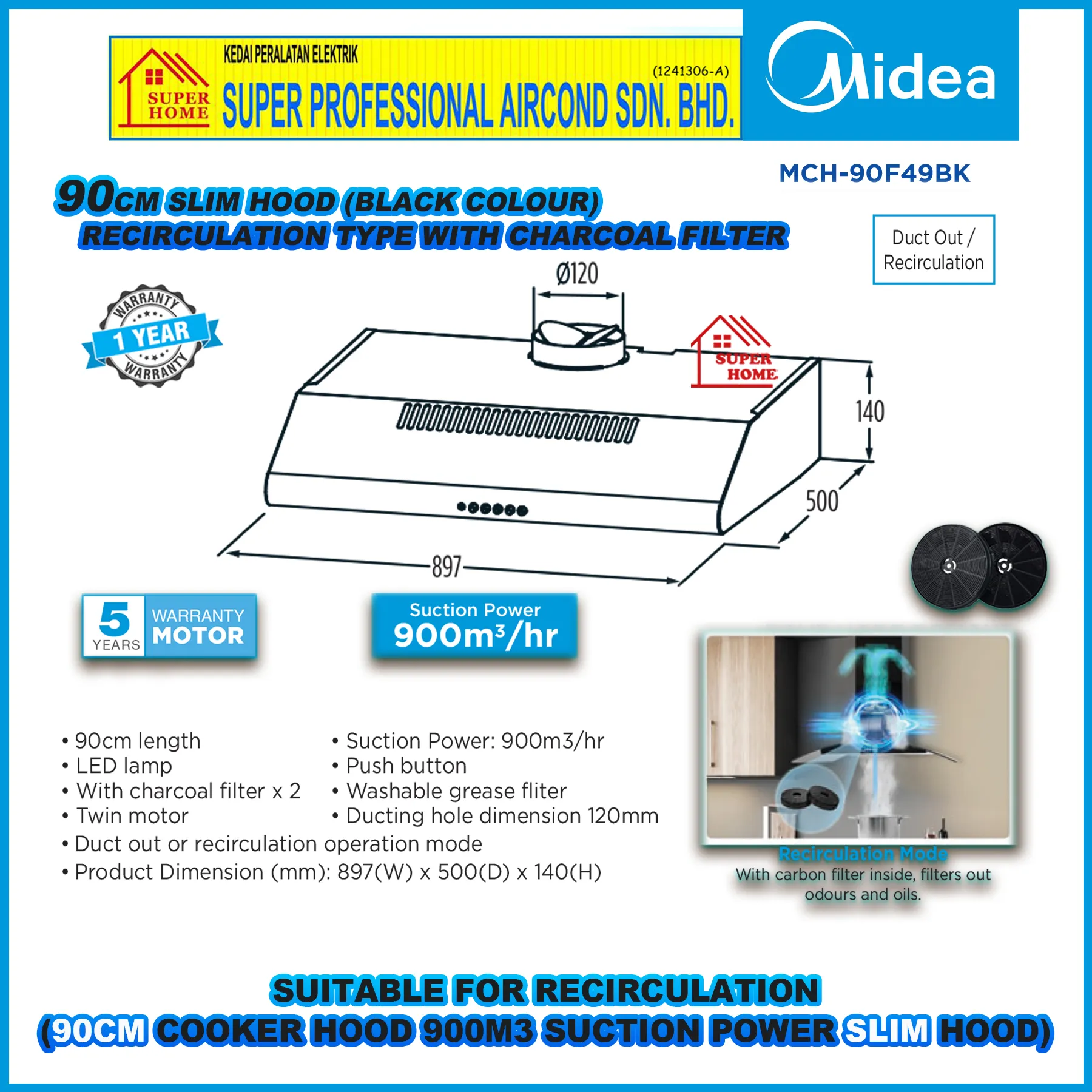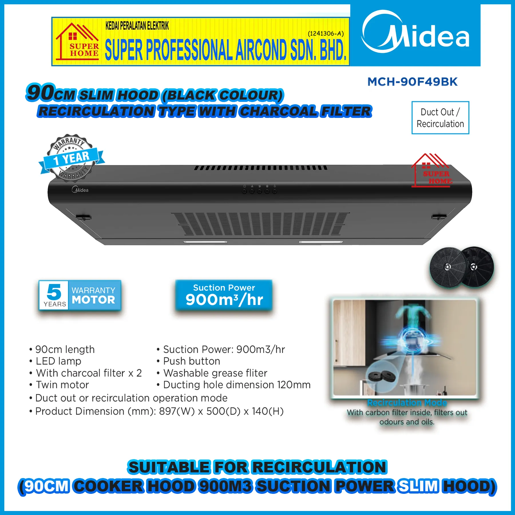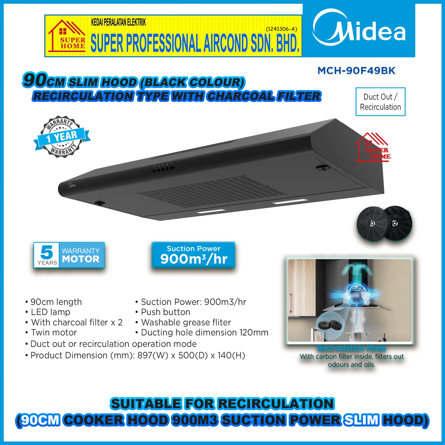 Midea Slim Hood MCH-90F49BK Black ((90cm)) Recirculation System Cooker Hood