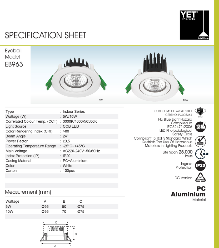 The YETPLUS EB963 LED EYEBALL 240V 25,000HRS IP20 CRI80 [5W/10W] [616LM/663LM/665LM/1149LM/1185LM/1206LM] [3000K/4000K/6500K] (SIRIM APPROVED) is the perfect choice for those seeking reliable performance, flexible lighting control, and trusted certification.