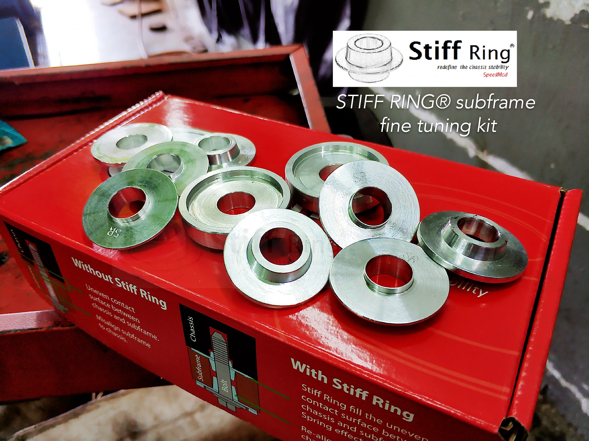 With the Stiff Ring in proper place, the gap is filled up to stop the movement of the sub frame and the car body forever and provide ideal alignment between both, as a result of a perfect geometry setup. Uneven surface is filled up by Stiff Ring, thus, spring effect is remove and resulting a comfortable cabin even further improved the car stability.