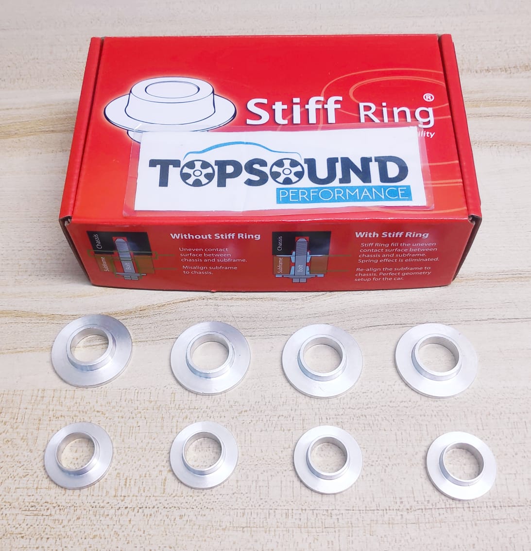 With the Stiff Ring in proper place, the gap is filled up to stop the movement of the sub frame and the car body forever and provide ideal alignment between both, as a result of a perfect geometry setup. Uneven surface is filled up by Stiff Ring, thus, spring effect is remove and resulting a comfortable cabin even further improved the car stability.