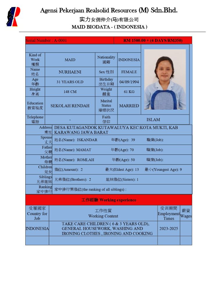Maid Agency Malaysia, Masai, Johor Bahru (JB) - Agensi Pekerjaan Realsolid Resources (M) Sdn Bhd