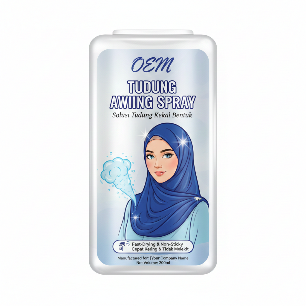 The lightweight formula dries quickly and is comfortable to wear under hijab, making it ideal for long hours at work, events, or daily activities. Suitable for all hair types, OEM Tudung Awning Spray is a must-have styling essential for a polished and confident appearance.