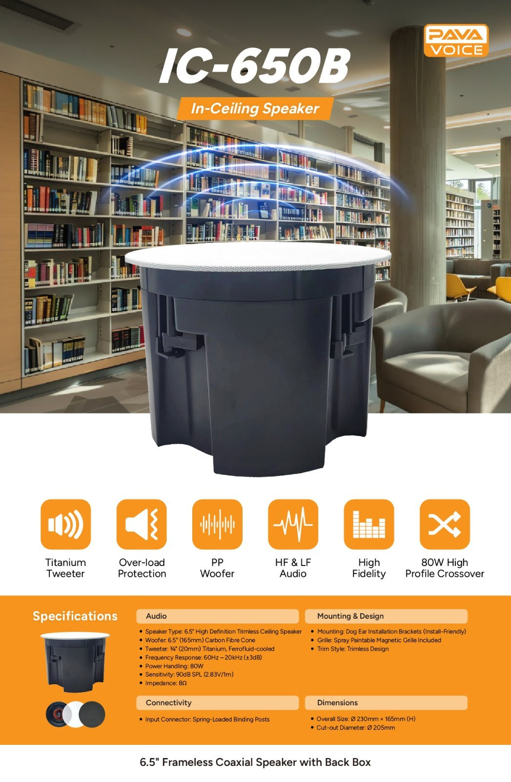 The PavaVoice IC-650B is a professional 6.5” frameless coaxial ceiling speaker designed for high-quality commercial audio applications. Engineered with an integrated back box, it delivers clear, consistent sound performance while maintaining a clean, low-profile architectural appearance.