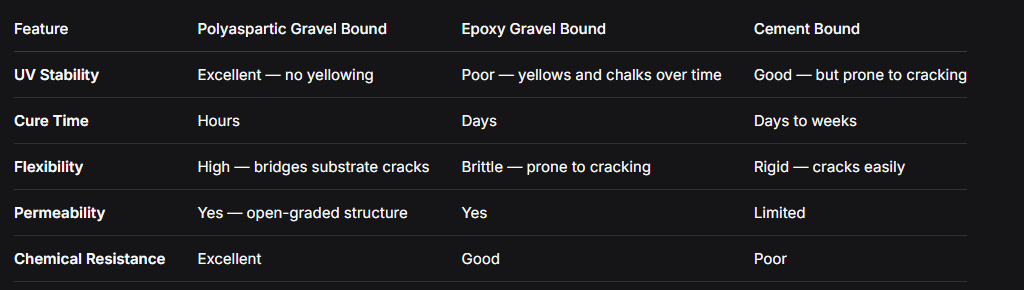 Polyaspartic gravel bound systems achieve a high compressive strength capable of supporting heavy vehicular traffic, including trucks and SUVs. The material also exhibits excellent flexibility, allowing it to absorb movement and resist cracking caused by thermal expansion, contraction, or minor substrate movement.