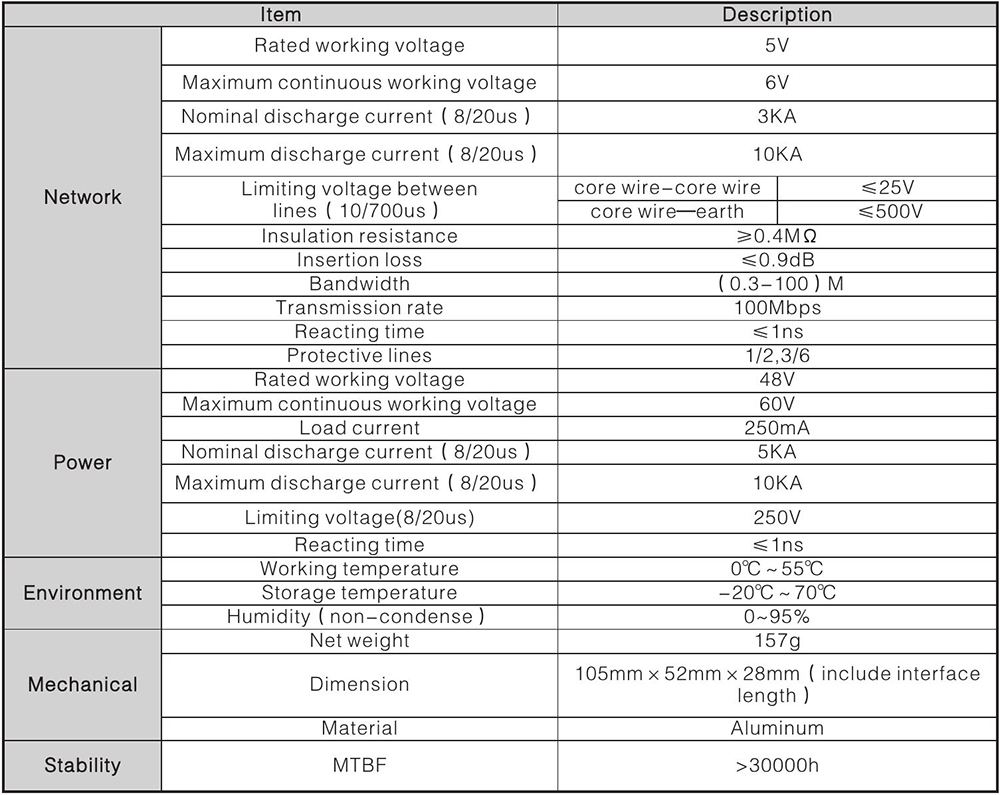 This protector is based on the IEC61643-21:2000 standard, integrated with surge protection for both network signal and power together It features multi-level protection, large maximum discharge current, low limiting voltage, quick reacting time, low inserting loss etc..It is adapted to HD IP camera data signal and power’s over voltage protection, exempt from the damage caused by reacting over-voltage, operating over-voltage and static electricity discharge etc..It can be widely used in security surveillance, environment surveillance etc..
