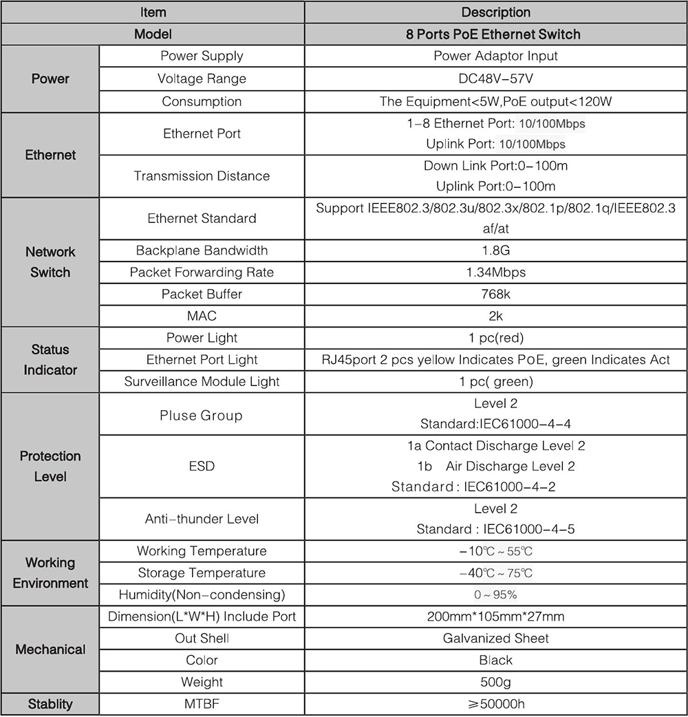 8 ports PoE Ethernet Switch is a surveillance security Ethernet switch which aims at Ethernet high definition surveillance, Ethernet project security system. The product fully combines the characteristic of surveillance security, provides fast packet forwarding ability and abundant backplane bandwidth, which ensures clear image and fluent transmission. Inserted static, surge protection circuit can improve product stability. The product supports one key CCTV model, can achieve VLAN, QoS priority after configuration, control the Net storm, protect the information security, prevent the viral transmission and Ethernet attack, fully satisfy the Ethernet video surveillance security system and Ethernet project needs.