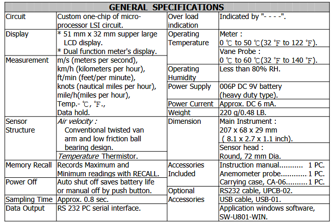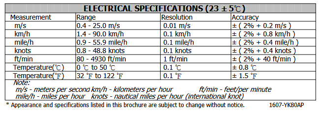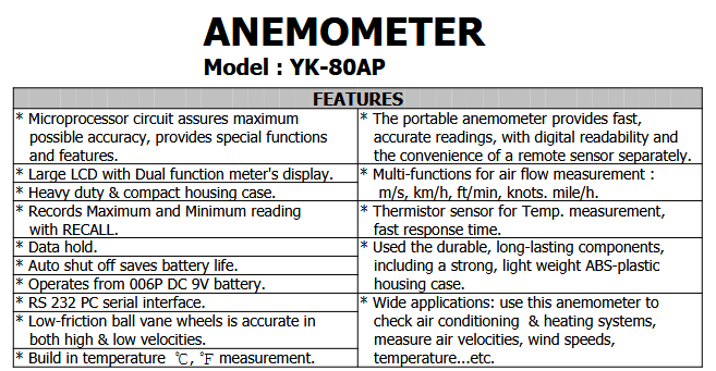 Lutron YK-80AP is an anemometer with external probe, that can measure gas flow rate in range 0,4 - 25,0 m/s and temperature in range 0 - 50 °C.