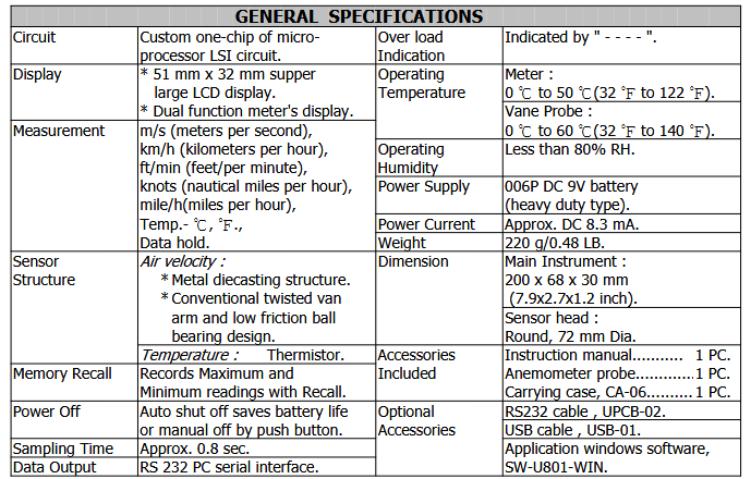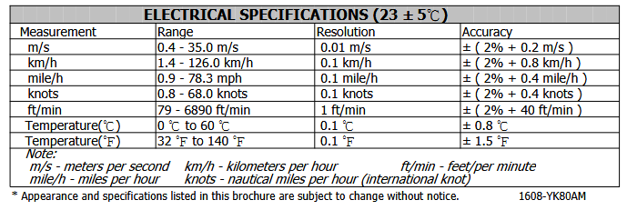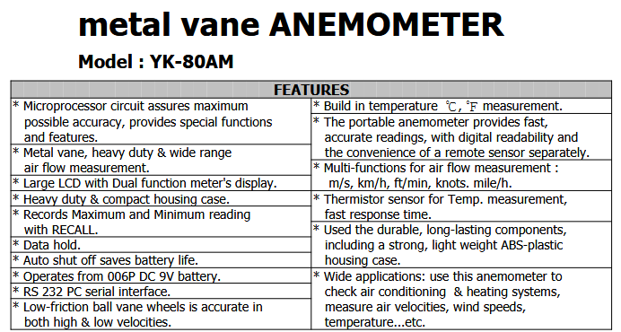 Lutron YK-80AM is an anemometer with external probe, that can measure gas flow rate in range 0,4 - 35,0 m/s and temperature in range 0 - 80 °C.