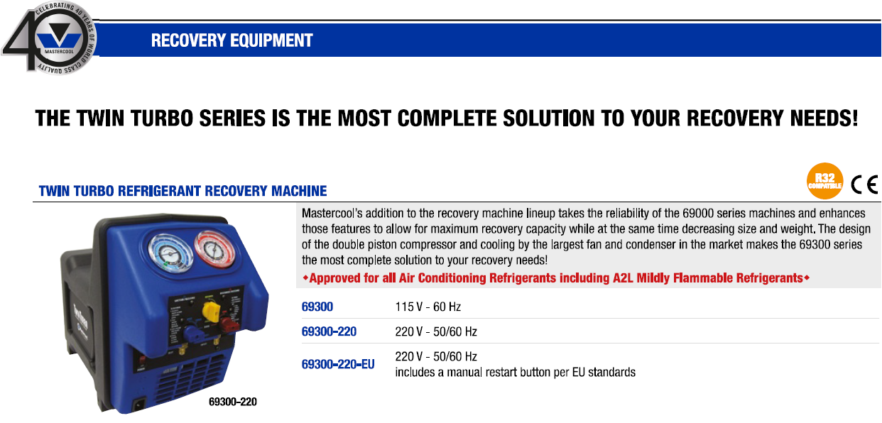 These recovery systems are compact, lightweight and work with all refrigerants. They’re ideal for commercial, residential or industrial appliance applications. Our recovery systems offer a state-of-the-art 1/2 HP oil-less compressor with a built-in high volume cooling fan. This new innovative design delivers maximum cooling efficiency which keeps the compressor working at high capacities in even the hottest climates. The compressor is also protected by an automatic low pressure cut-off switch that shuts off the unit once the recovery is complete. This AUTO SHUT-OFF feature eliminates the risk of compressor failure and reduces the user’s need to monitor the entire recovery system. All of our recovery systems offer our newest color-coded gauges with pressure readings in PSI, BAR and Mpa. Our stainless steel ball valve designed manifold controls the flow smoothly and quickly with only a 1/4 turn. With all of this protected by a reinforced hard plastic case, Mastercool’s new recovery systems will meet all your refrigerant recovery needs.