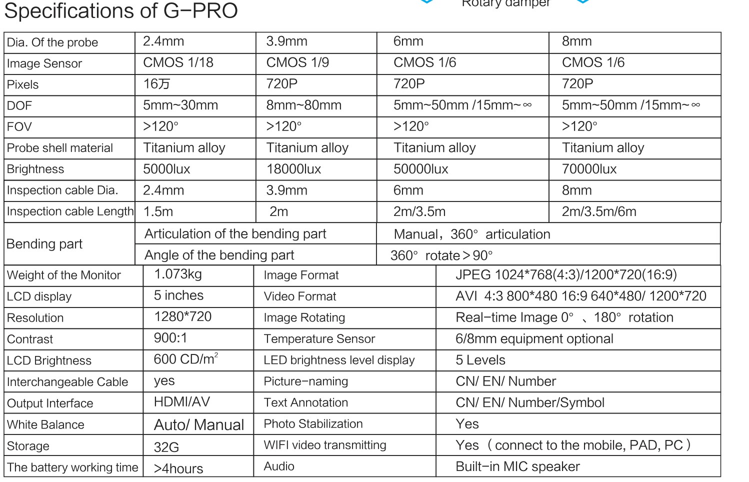 Support different interchangeable probes to quickly reconfigure different lengths and diameter (2.4mm / 4mm / 6mm / 8mm) and different function, such as white light LEDs, UV LEDs and infrared LEDs.