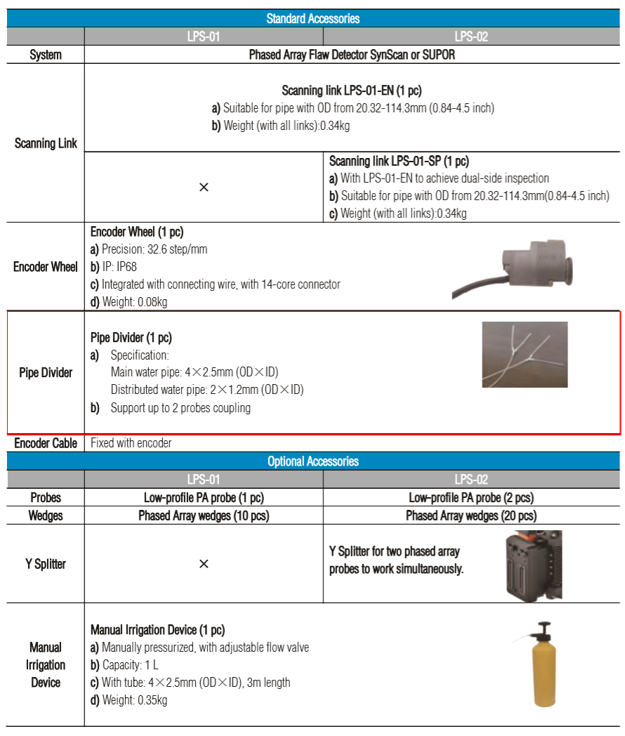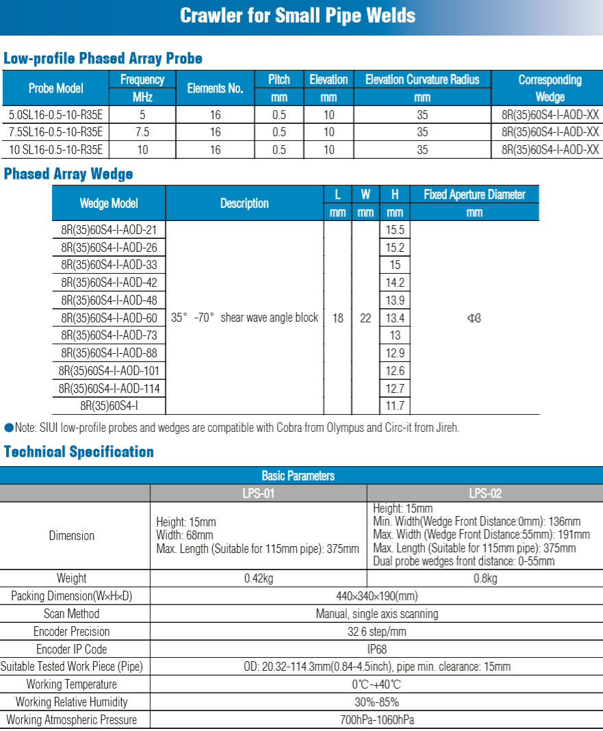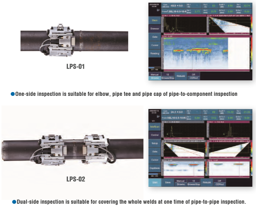 The Phased Array low profile crawler LPS-01 and LPS-02 are compatible with Phased Array ultrasonic flaw detector, which is used to perform circumferential weld inspection on small diameter pipe