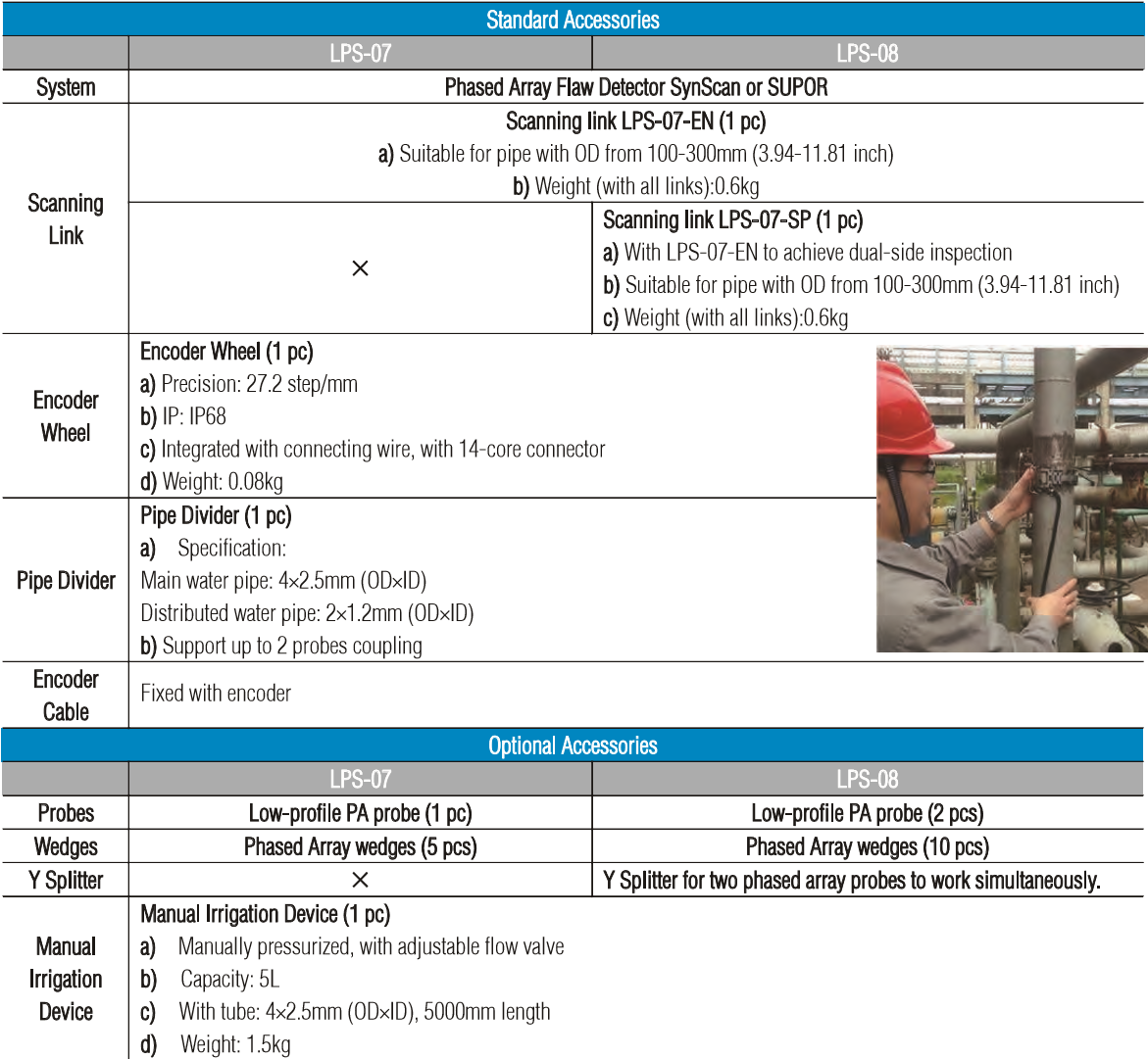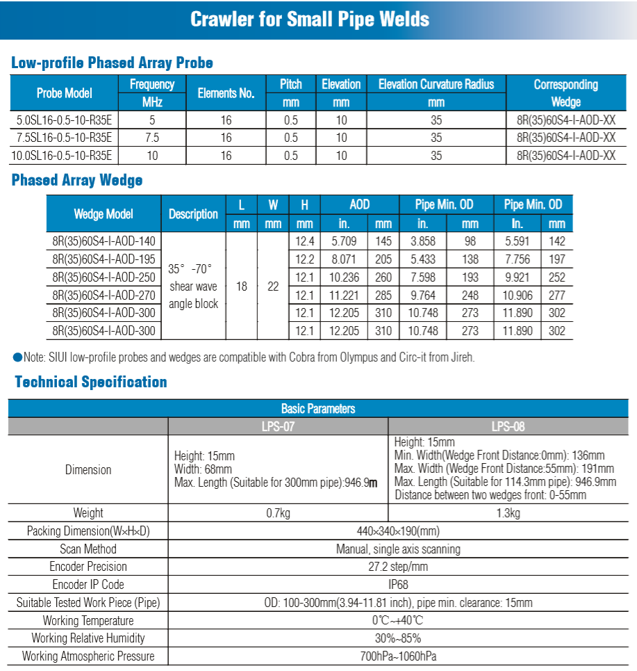 The Phased Array low profile crawler LPS-07 and LPS-08 are compatible with Phased Array ultrasonic flaw detector, which is used to perform circumferential weld inspection on pipes (OD:100mm-300mm).