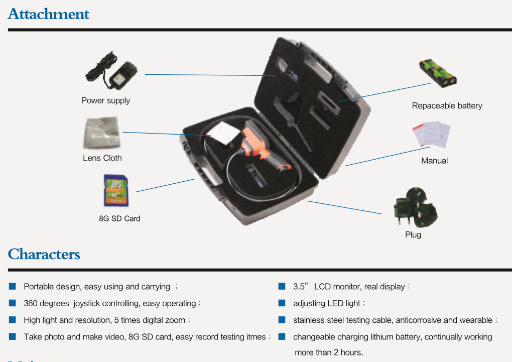 High sensitiveness CCD/CMOS image sensor.AA batteries,continually working more than 2 hours. Portable videoscope Specification Operating Unit: