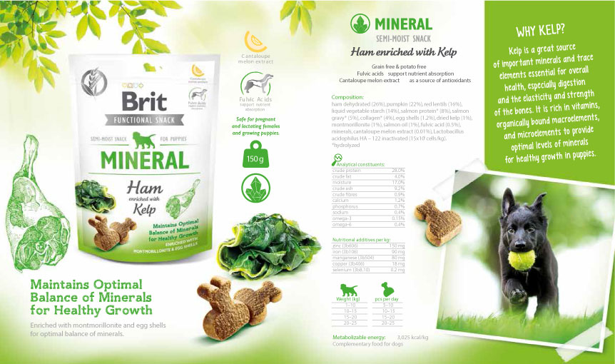 Kelp is a great source of important minerals and trace elements essential for overall health, especially digestion and the elasticity and strength of the bones. It is rich in vitamins, organically bound macroelements, and microelements to provide optimal levels of minerals for healthy growth in puppies.