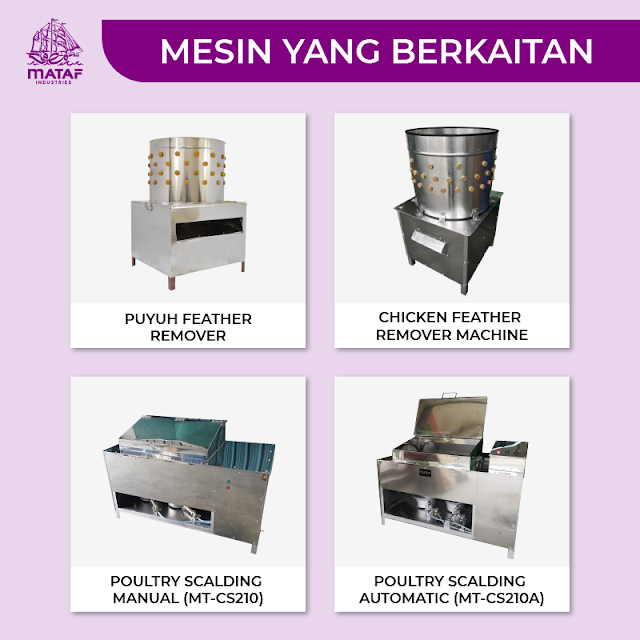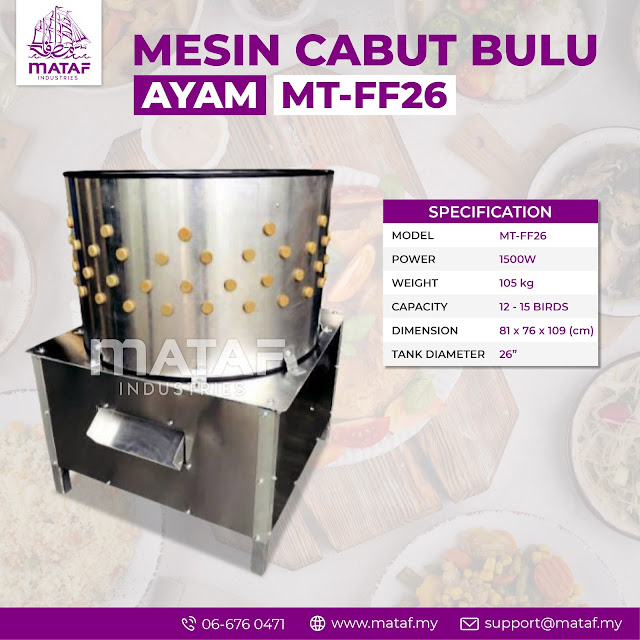 Mesin Cabut Bulu Ayam/ Poultry Feather Remover (12-15 Ekor) MT-FF26 digunakan secara meluas dalam industri pemprosesan daging ayam segar di Malaysia. Dengan Mesin Cabut Bulu Ayam ini, kerja-kerja pemprosesan mencabut bulu ayam menjadi lebih efektif dari segi masa, kos dan tenaga kerja seterusnya menjadikan jumlah pengeluaran daging ayam segar akan meningkat berbanding kaedah manual