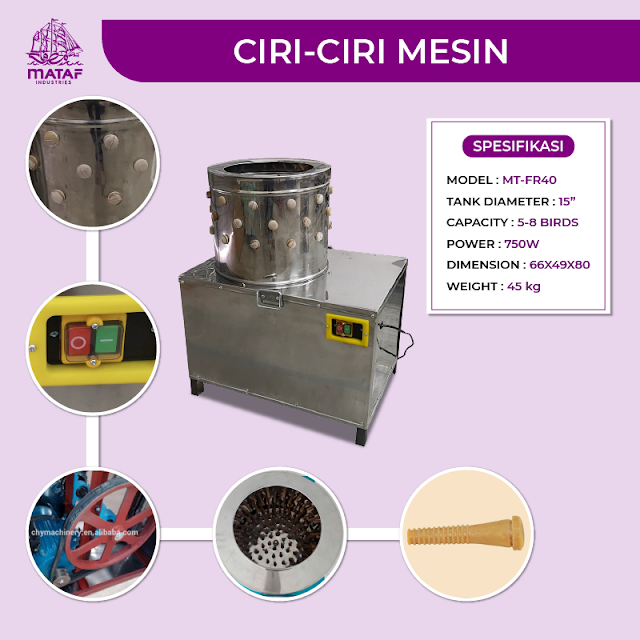 Mesin Cabut Bulu Puyuh MT-FR40 direka untuk memudahkan dan mempercepatkan proses mencabut bulu puyuh. Ia mampu mencabut bulu 5 hingga 8 ekor puyuh dalam satu masa, menjimatkan masa dan tenaga kerja. Mesin ini sesuai digunakan di ladang ternakan kecil, pusat pemprosesan makanan, dan pembekal puyuh. Hasilnya bersih, kemas, dan seragam. Dilengkapi dengan drum keluli tahan karat dan motor berkuasa tinggi, mesin ini tahan lama serta mudah dibersihkan dan disenggara selepas digunakan.