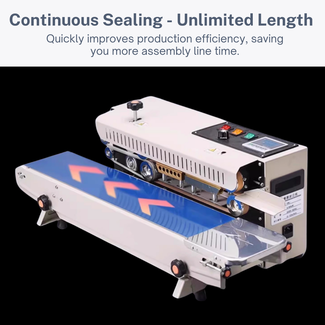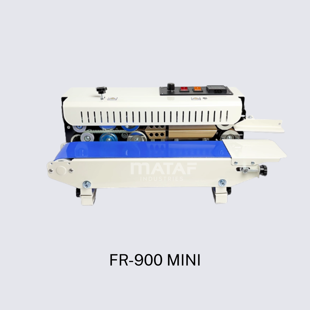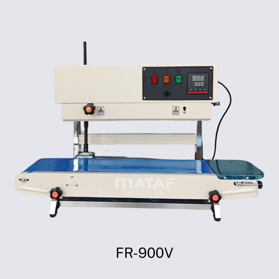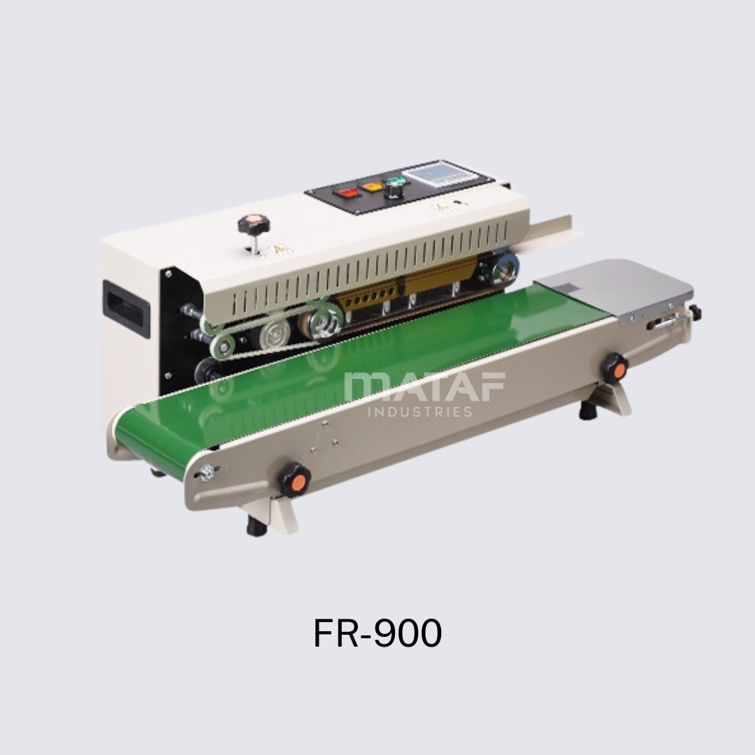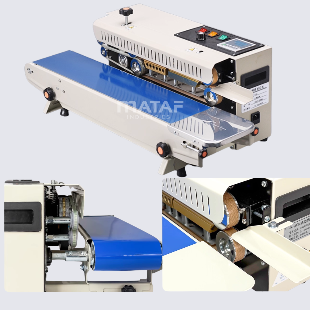 The Mataf Continuous Sealing Machine FR-900 is a practical addition to your production line. It seals plastic and aluminum foil packaging efficiently and is equipped with a conveyor system to move packages to the next process. This model also supports a date printing function for convenient product labeling.