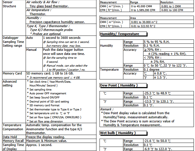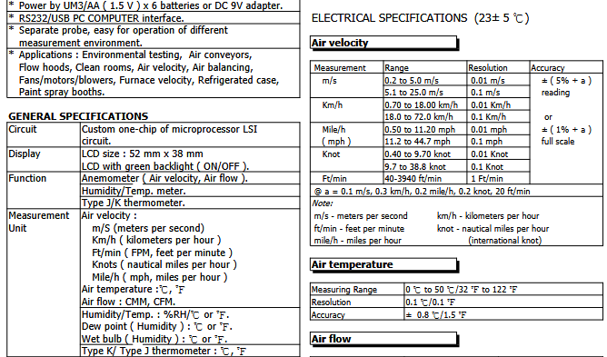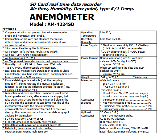 The LUTRON AM-4224SD is an anemometer with telescopic probe and humidity probe, that can measure gas flow rate in range 0,2 - 25,0 m/s, air flow, humidity, dew point, wet bulb temperature and temperature in range 0 - 50 °C. This device is capable of storing measurements onto SD card in MS Excel .xls format and can communicate via RS232 or USB.