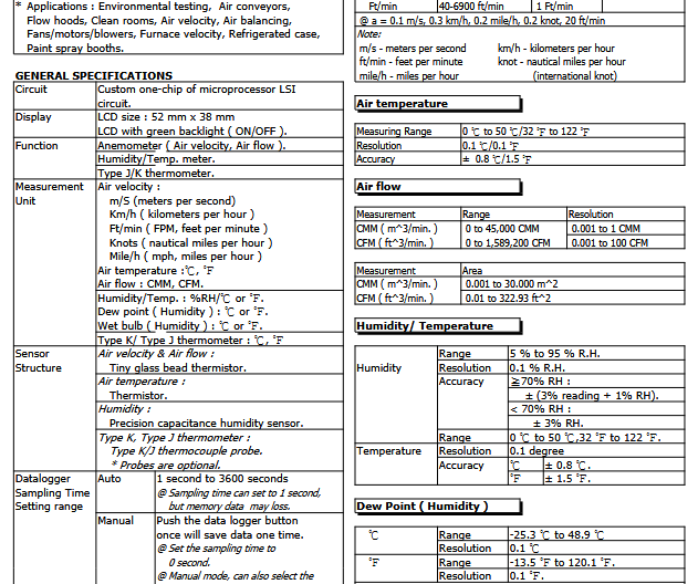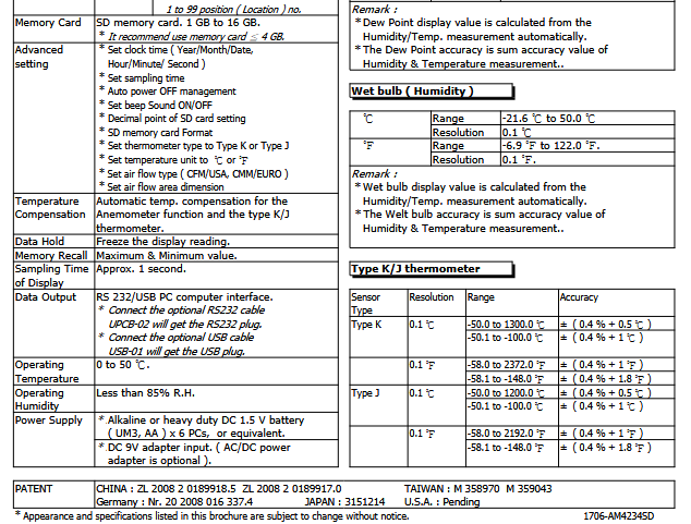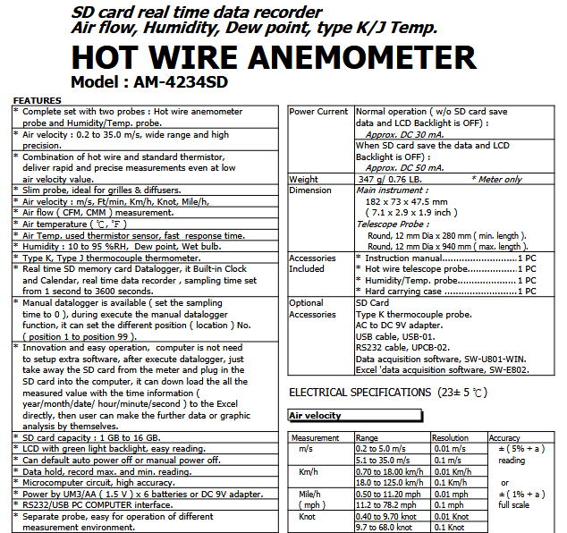 The LUTRON AM-4234SD is an anemometer with telescopic probe and humidity probe, that can measure gas flow rate in range 0,2 - 35,0 m/s, air flow, humidity, dew point, wet bulb temperature and temperature in range -100 - 1300 °C by K-type thermocouple, or in range 0 - 50 °C without external thermocouple. This device is capable of storing measurements onto SD card in MS Excel .xls format and can communicate via RS232 or USB.