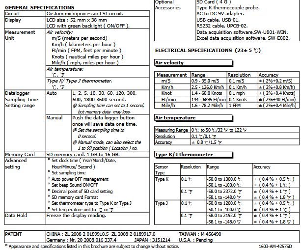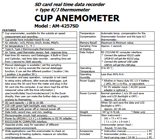 The LUTRON AM-4257SD is an anemometer with cup external probe, that can measure gas flow rate in range 0,9 - 35,0 m/s and temperature in range 0 - 50°C or -50 - 1300 °C by K-type thermocouple. This device is capable of storing measurements onto SD card and can communicate via RS232 or USB.